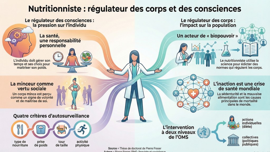 Le nutritionniste dépasse le conseil : il façonne corps et comportements, entre liberté individuelle, normes de minceur, et régulation publique alimentaire.