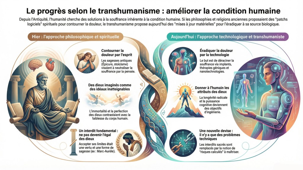 Depuis des millénaires, on cherche à réparer le corps, éviter la souffrance et repousser la mort. Aujourd’hui, le transhumanisme reprend ce vieux rêve, mais avec des nanorobots, des gènes édités et des technologies qui veulent réécrire le vivant. La vraie question : améliorons-nous l’humain ou sommes-nous en train de le remplacer ?