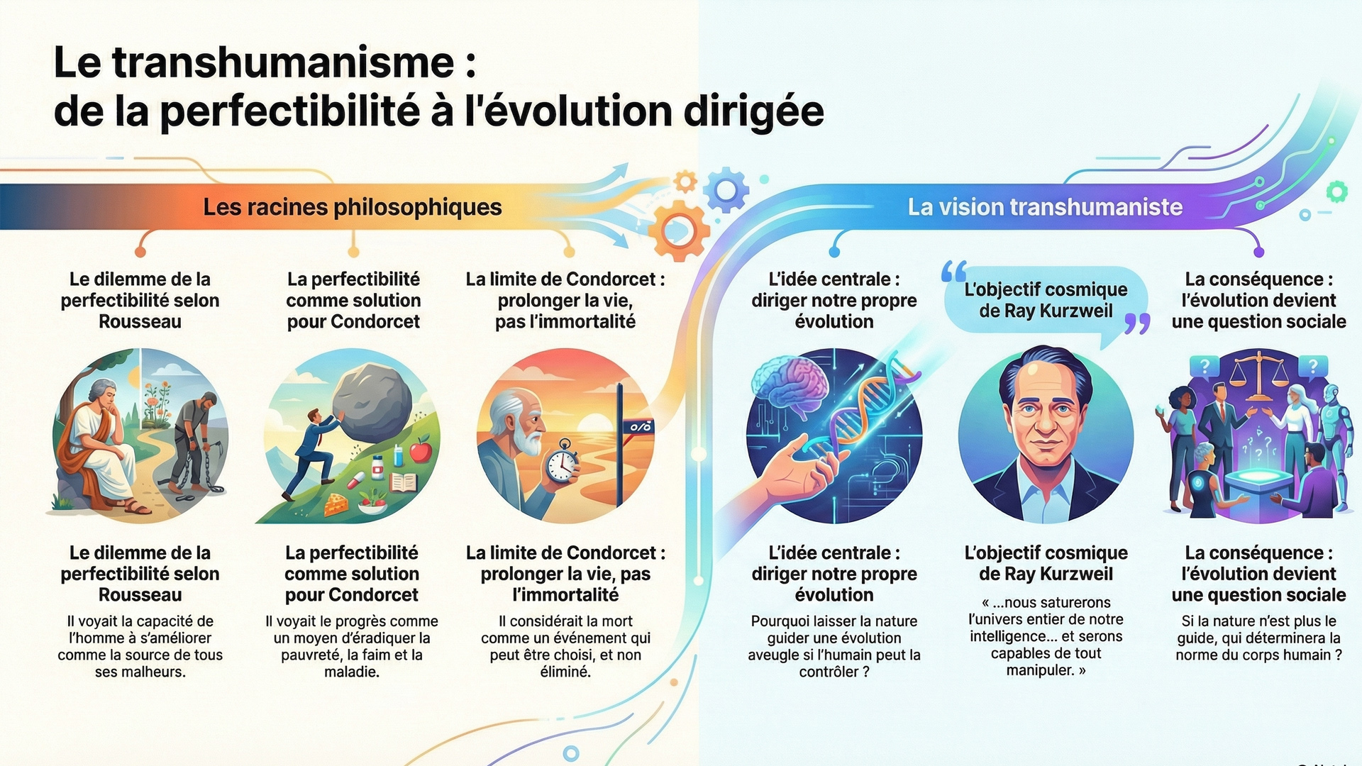 Condorcet rêvait d’un progrès humain capable d’éradiquer pauvreté et maladie. Les transhumanistes vont plus loin : ils veulent que l’homme contrôle sa propre évolution, jusqu’à remodeler son corps… et peut-être l’univers. Progrès infini ou utopie ? L’avenir reste à réinventer.