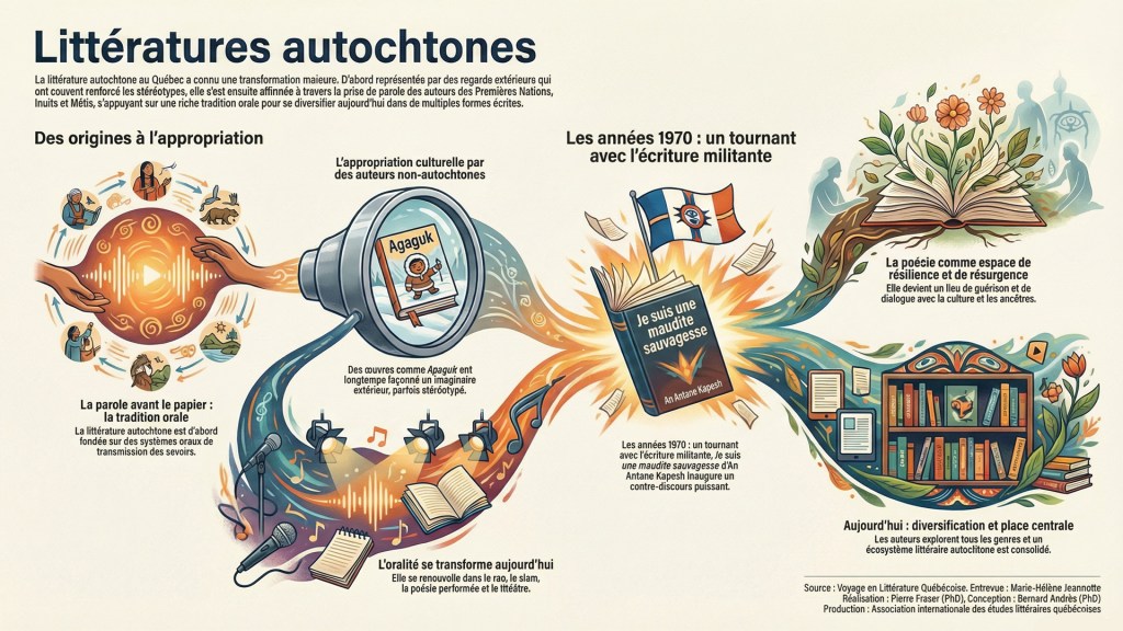La littérature autochtone au Québec ne naît pas avec l’écriture, mais dans l’oralité. Longtemps éclipsées par des représentations extérieures et stéréotypées, les voix autochtones ont progressivement investi l’espace littéraire. De l’essai pamphlétaire à la poésie, du théâtre rituel à la science-fiction, cette littérature contemporaine affirme aujourd’hui sa pluralité, sa résilience et sa pleine légitimité.