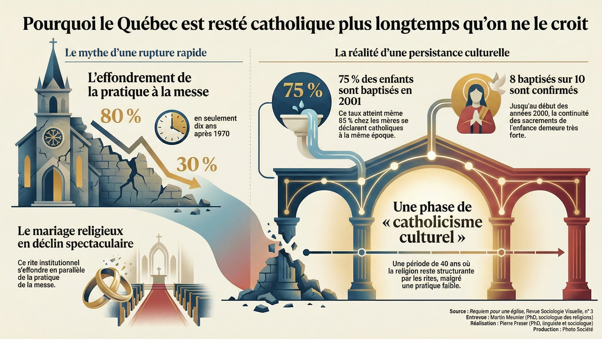Au Québec, la pratique catholique s’effondre après 1960, mais baptêmes et rites persistent longtemps, révélant un catholicisme culturel durable.