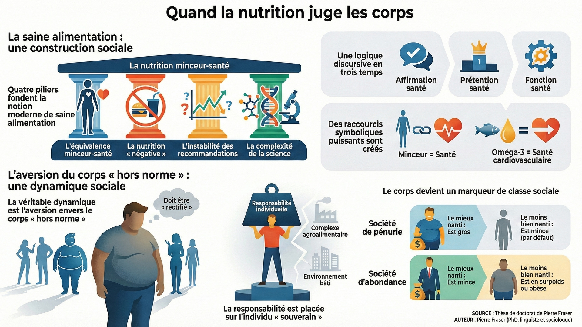 Cet article analyse la saine alimentation comme une construction sociale structurée par quatre constantes historiques : l’association entre minceur et santé, la logique de la nutrition négative et des aliments « vedettes », l’instabilité des recommandations nutritionnelles et la multidisciplinarité conflictuelle de la science de la nutrition. Il montre que la saine alimentation repose sur une logique discursive (affirmation, prétention et fonction santé) et qu’elle agit comme un système symbolique produisant des normes, des catégories et des hiérarchies corporelles. On met ici en évidence une dynamique fédératrice au cœur de la lutte contre l’obésité : l’aversion envers le corps hors norme, enracinée dans une longue histoire du gouvernement de soi et renforcée par l’idéologie de la responsabilité individuelle. Cette dynamique articule l’individu autonome, la discipline personnelle et l’équilibre alimentaire comme devoir moral. La lutte contre l’obésité apparaît ainsi moins comme une réponse sanitaire neutre que comme un dispositif de normalisation sociale des corps, profondément lié aux inégalités sociales, aux rapports de pouvoir et à la logique néolibérale, où le corps devient à la fois marqueur de classe, instrument de distinction et objet de régulation.