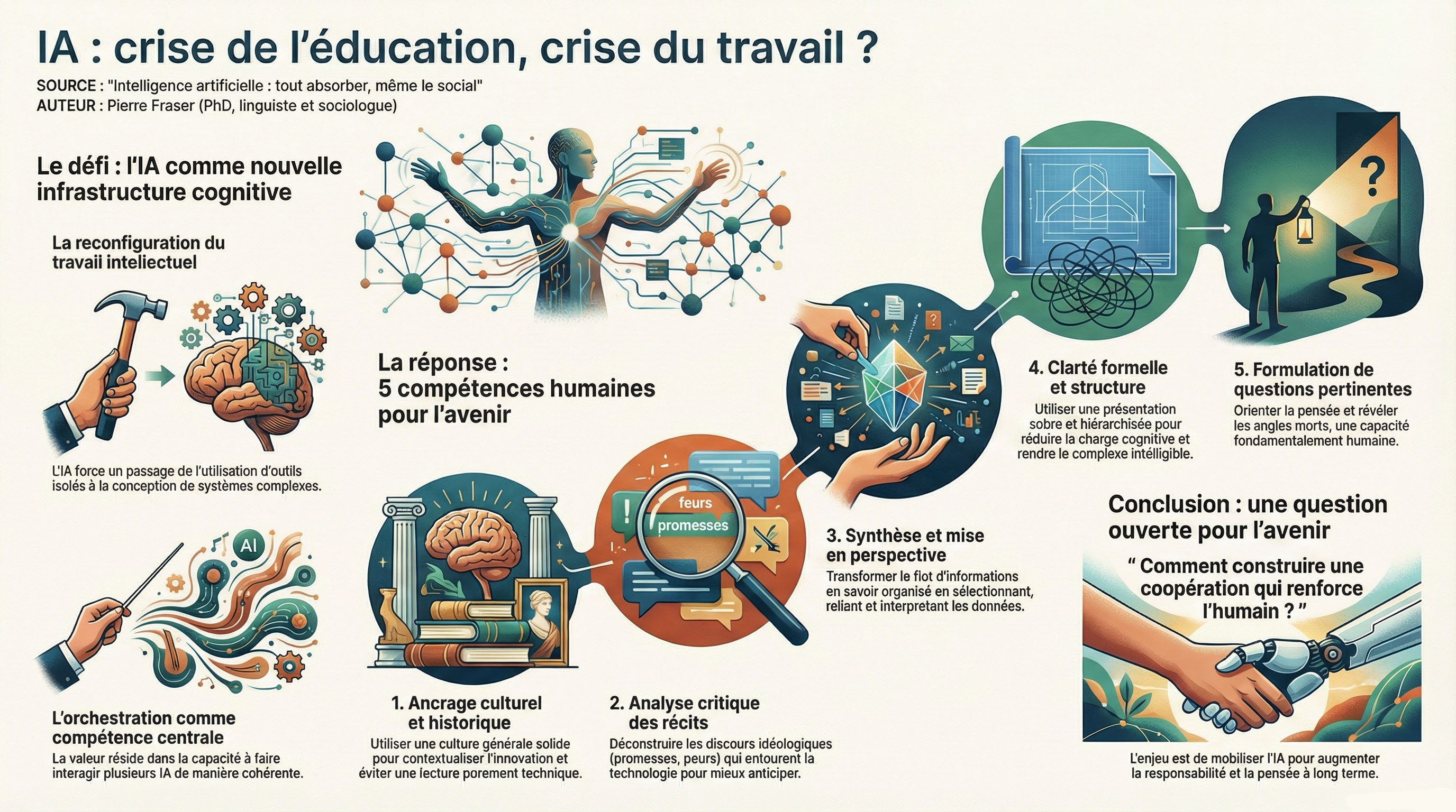 L’intelligence artificielle ne pose pas seulement une question technologique. Elle interroge la capacité collective à organiser la pensée dans un monde accéléré, automatisé et saturé d’informations. La valeur humaine se déplace vers l’orchestration, la culture, l’analyse critique, la synthèse et la clarté. L’avenir n’est pas écrit par les machines. Il dépend des cadres intellectuels, culturels et narratifs que les sociétés choisiront de mobiliser. La question centrale demeure ouverte et volontairement inconfortable : comment organiser une coopération entre humains et intelligences artificielles qui renforce la compréhension et la responsabilité, plutôt que de dissoudre le jugement dans l’automatisation ?
