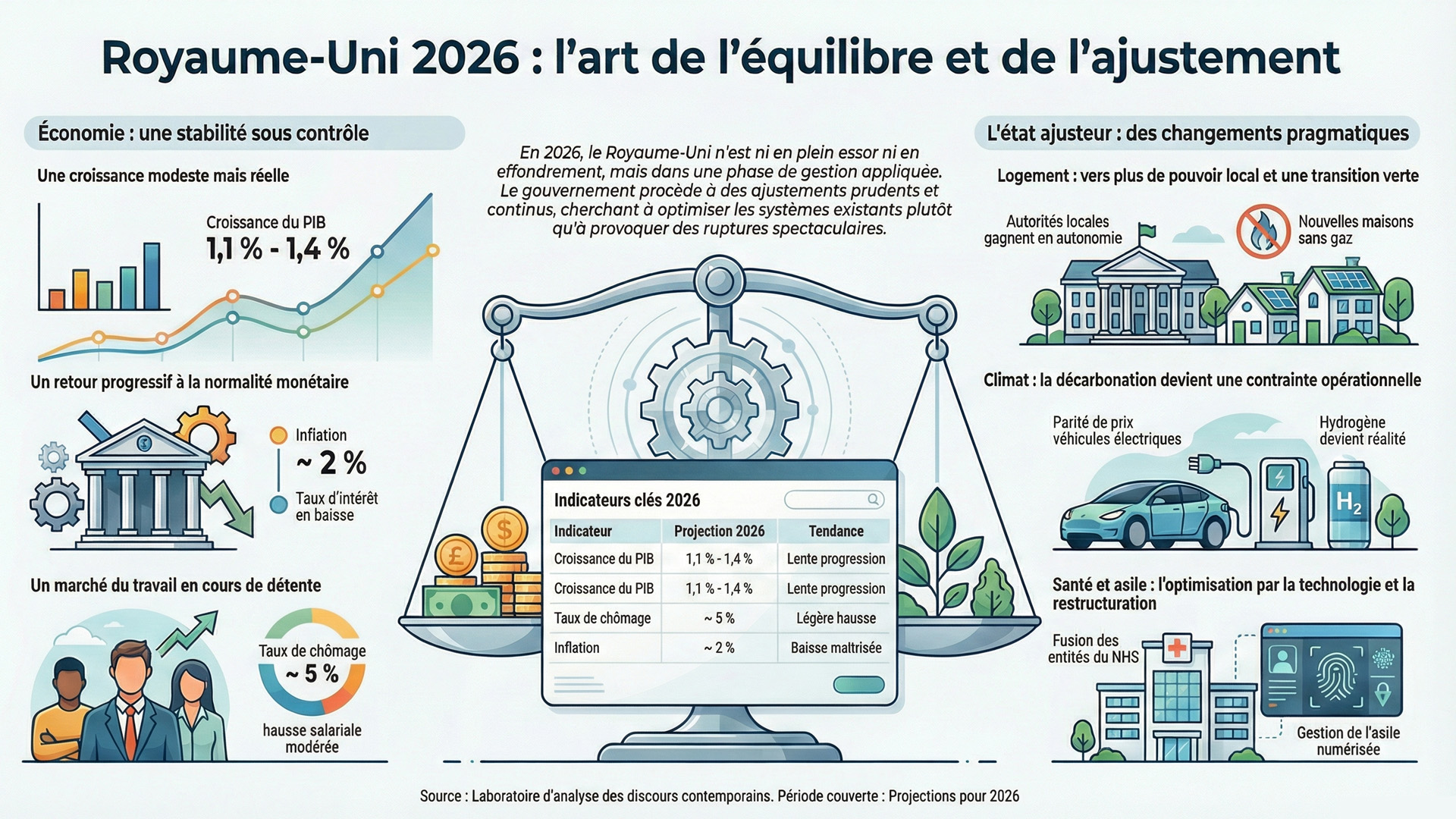Pour 2026, le Royaume-Uni avance sur une ligne de crête. D’un côté, un État qui s’agite, légifère, annonce, ajuste. De l’autre, un socle économique, social et géopolitique qui résiste, grince et parfois dérange. Le moment est présenté comme décisif. Il l’est sans doute. Mais pas dans le fracas spectaculaire annoncé par certains commentateurs. Plutôt dans une lente tentative de réécriture du logiciel britannique, à mi-chemin entre rupture assumée et bricolage lucide. Car contrairement au récit commode du chaos permanent, le gouvernement en place ne gouverne pas à l’aveugle. Il expérimente. Il déplace des curseurs. Il tente, parfois maladroitement, de desserrer l’étau d’une orthodoxie économique devenue plus dogmatique que performante. Le changement est discret, presque feutré. Mais il est réel.